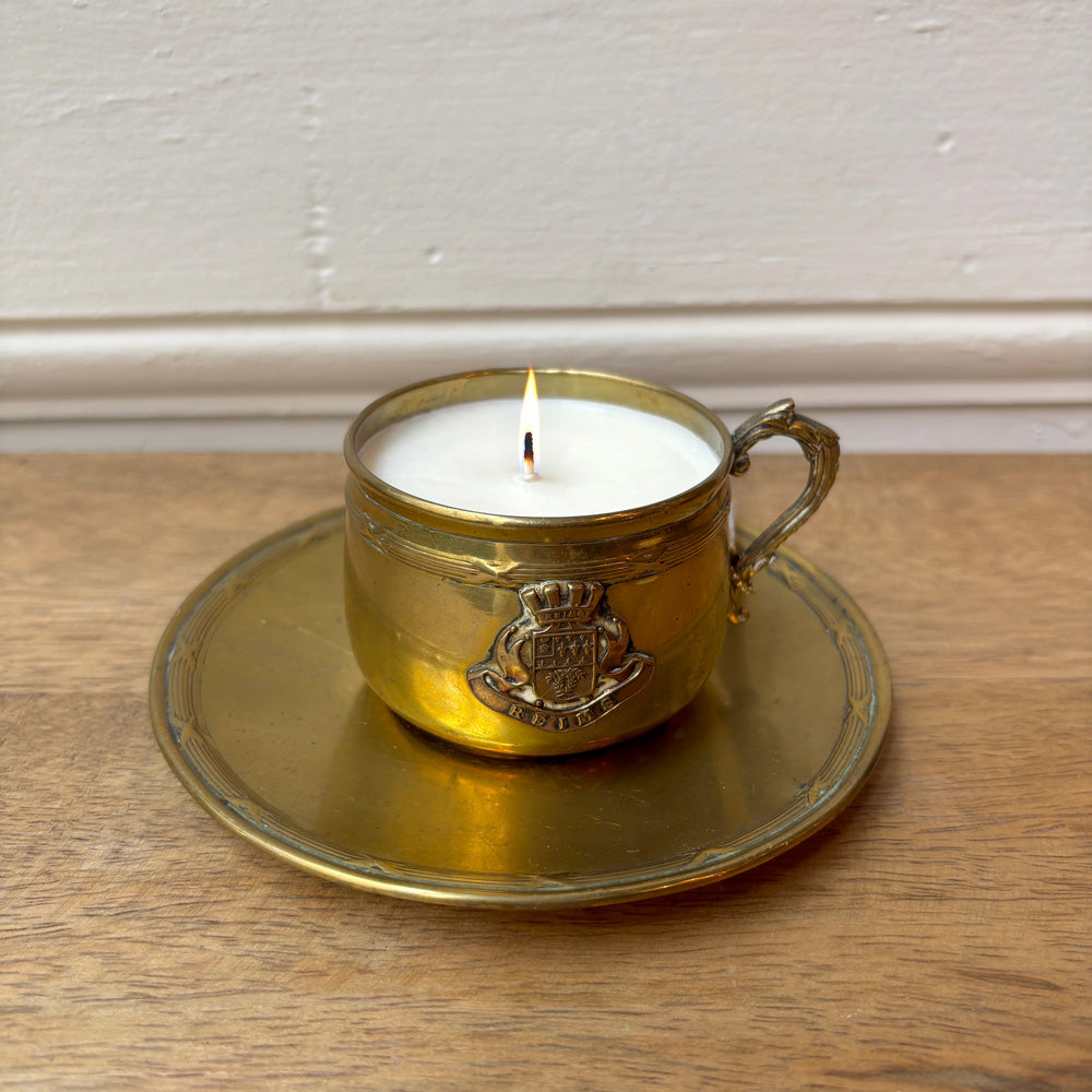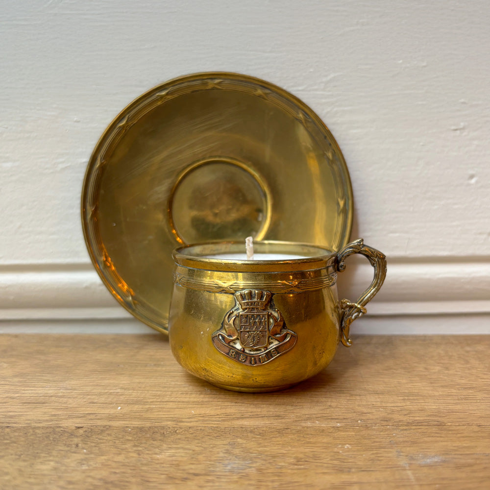 Bougie Tasse en métal doré inscription "Reims" par Charity Bougies. On aime l'histoire de cette marque coup de cœur pour Bonnesoeurs: tous les contenants sont issus du recyclage solidaire et proviennent de ventes de charité. Les sœurs à l'origine de la marque coulent ensuite de la cire végétale dans ces contenants. Chaque bougie est unique (ou presque!). Le petit plus: Le contenant est réutilisable une fois la cire entièrement fondue.
