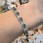 Bracelet ajustable composé de 7 fleurs bleues en pierres d'hématite tissées, par des fils métalliques, à des perles en lapis-lazuli.