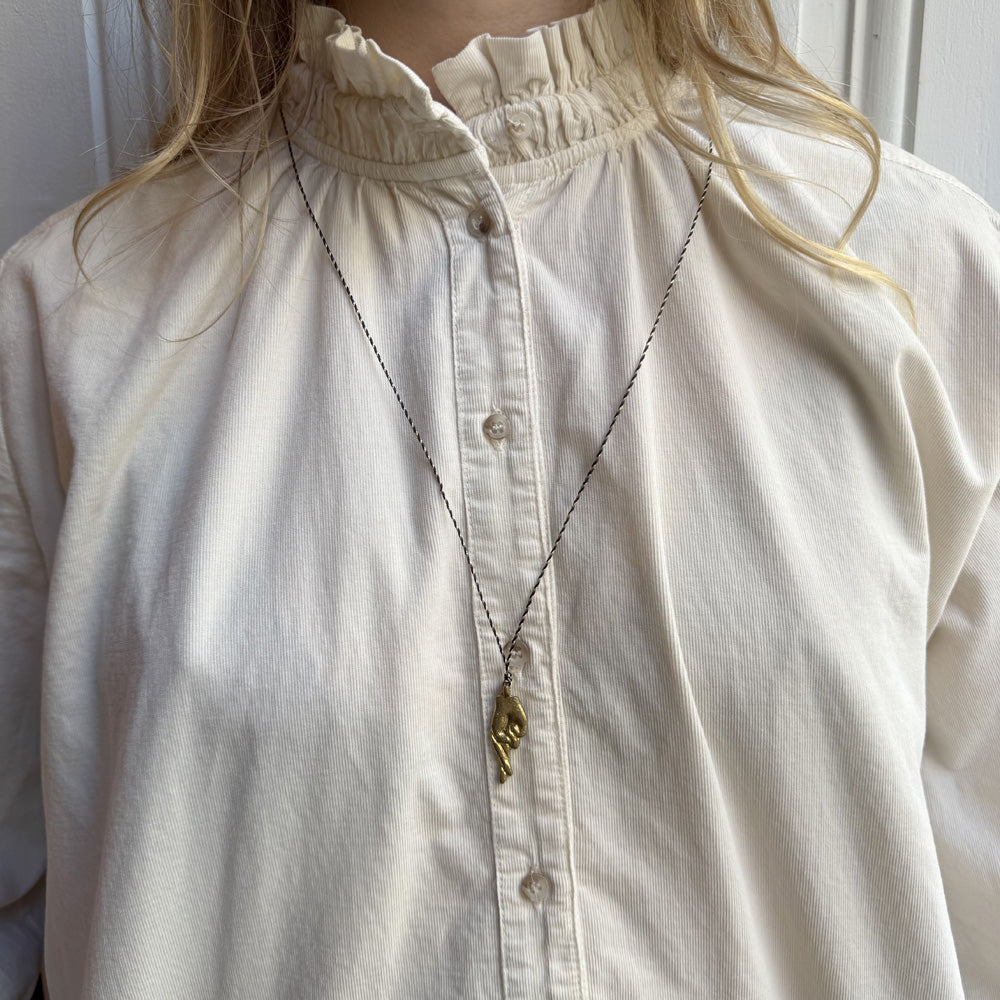 Il est monté sur un fil de coton lurex avec une pampille en laiton. Un nœud coulissant permet de régler sa longueur.
