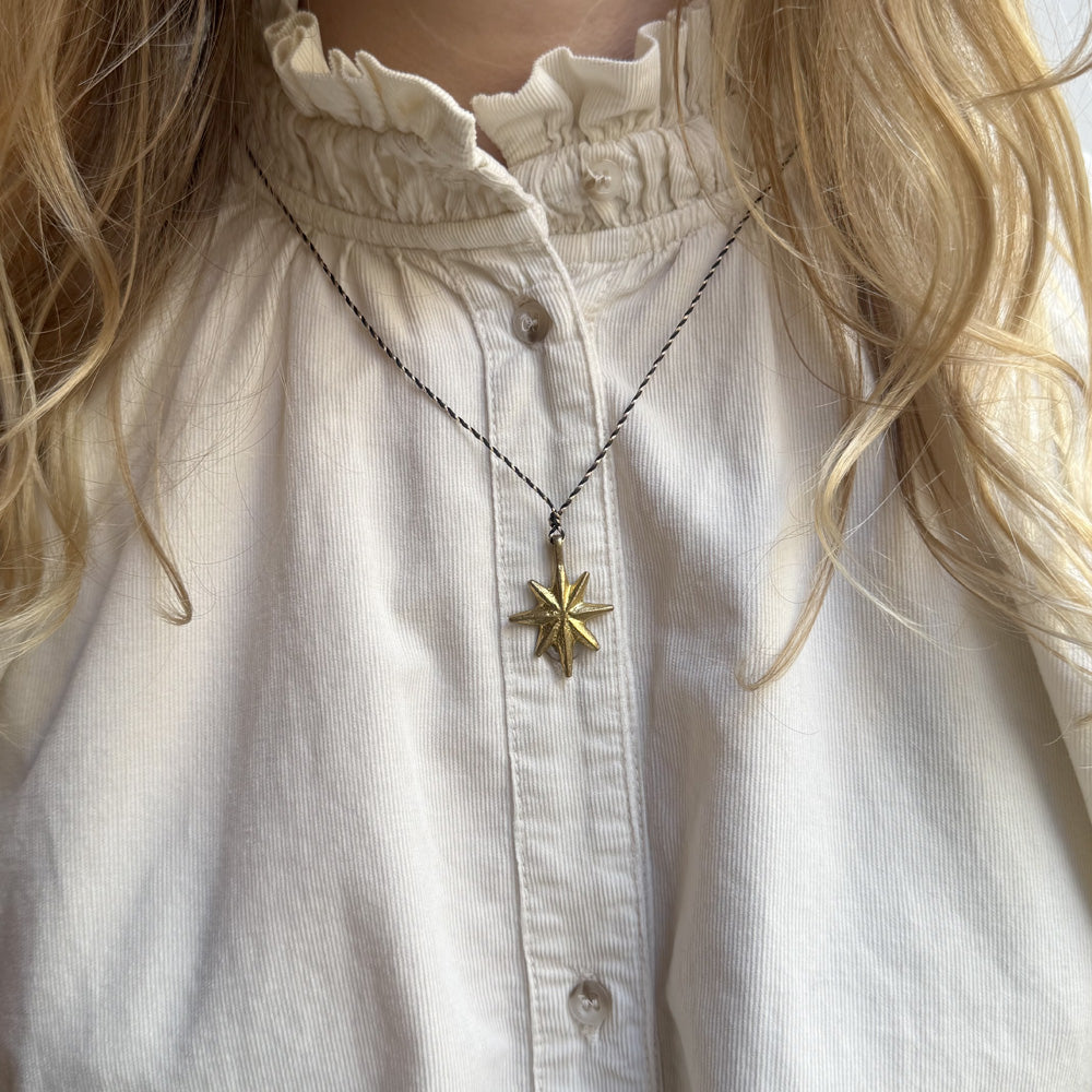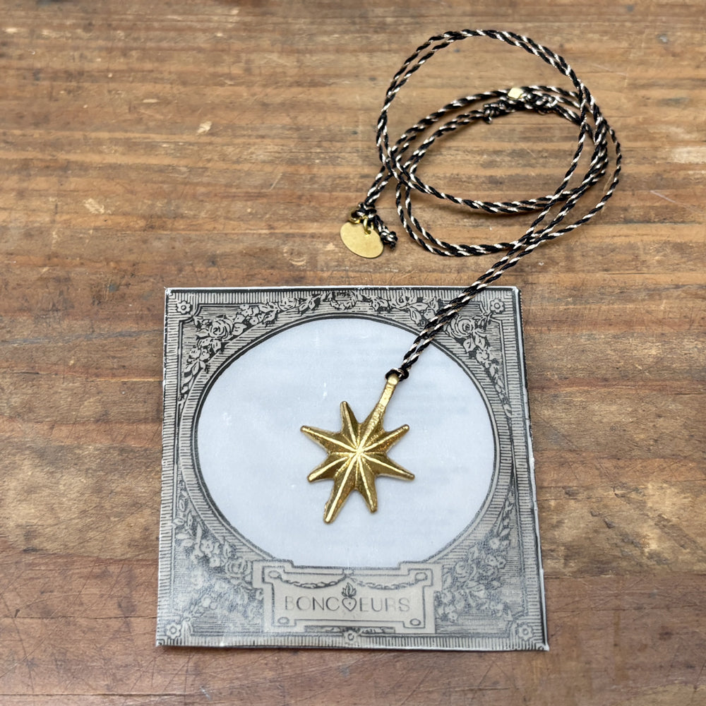 Il est monté sur un fil de coton lurex avec une pampille en laiton. Un nœud coulissant permet de régler sa longueur.
