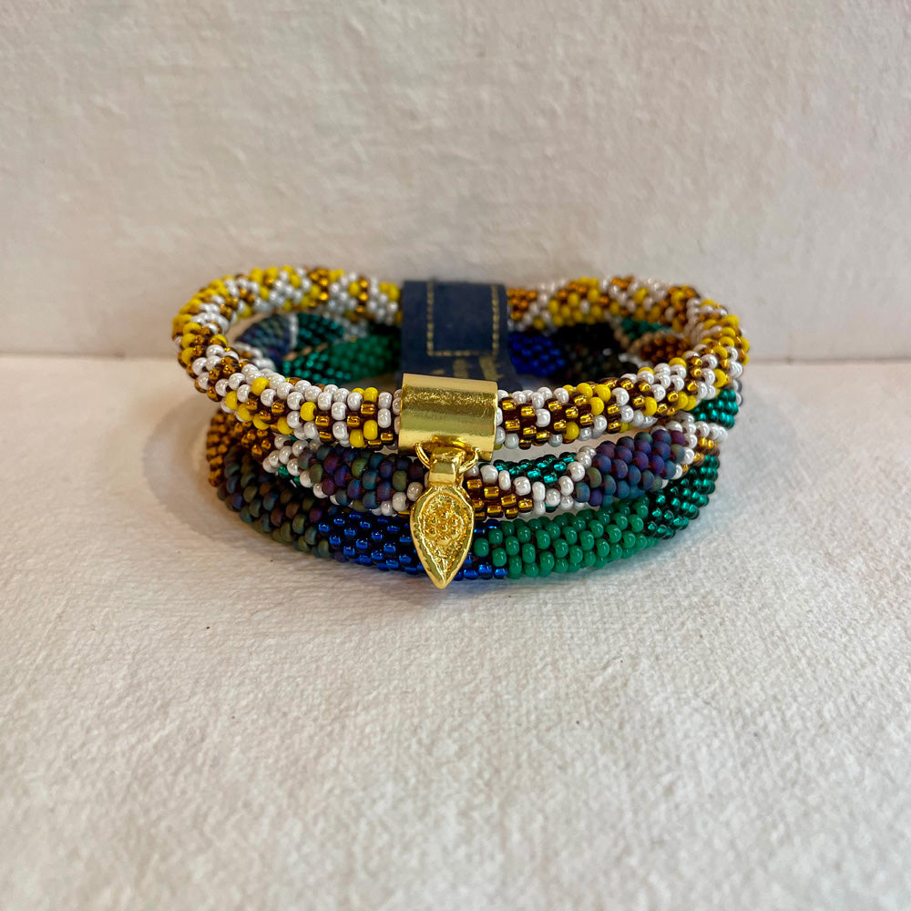 L' histoire : Les bracelets sont confectionnés à la main par des femmes népalaises qui crochètent chaques perles avec soin. L'intérieur des bracelets se compose d'un fil de coton très résistant sur lequel les perles sont enfilées puis crochetées l'une après l'autre en tubulaire.