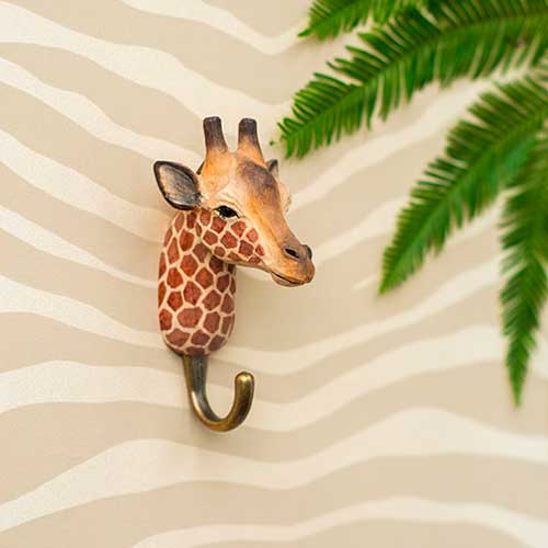 Cette patère originale vous permettra de suspendre vos vêtements ou encore vos bijoux. La tête de l’animal est taillée dans du bois et peinte à la main, le crochet est en métal de couleur bronze.