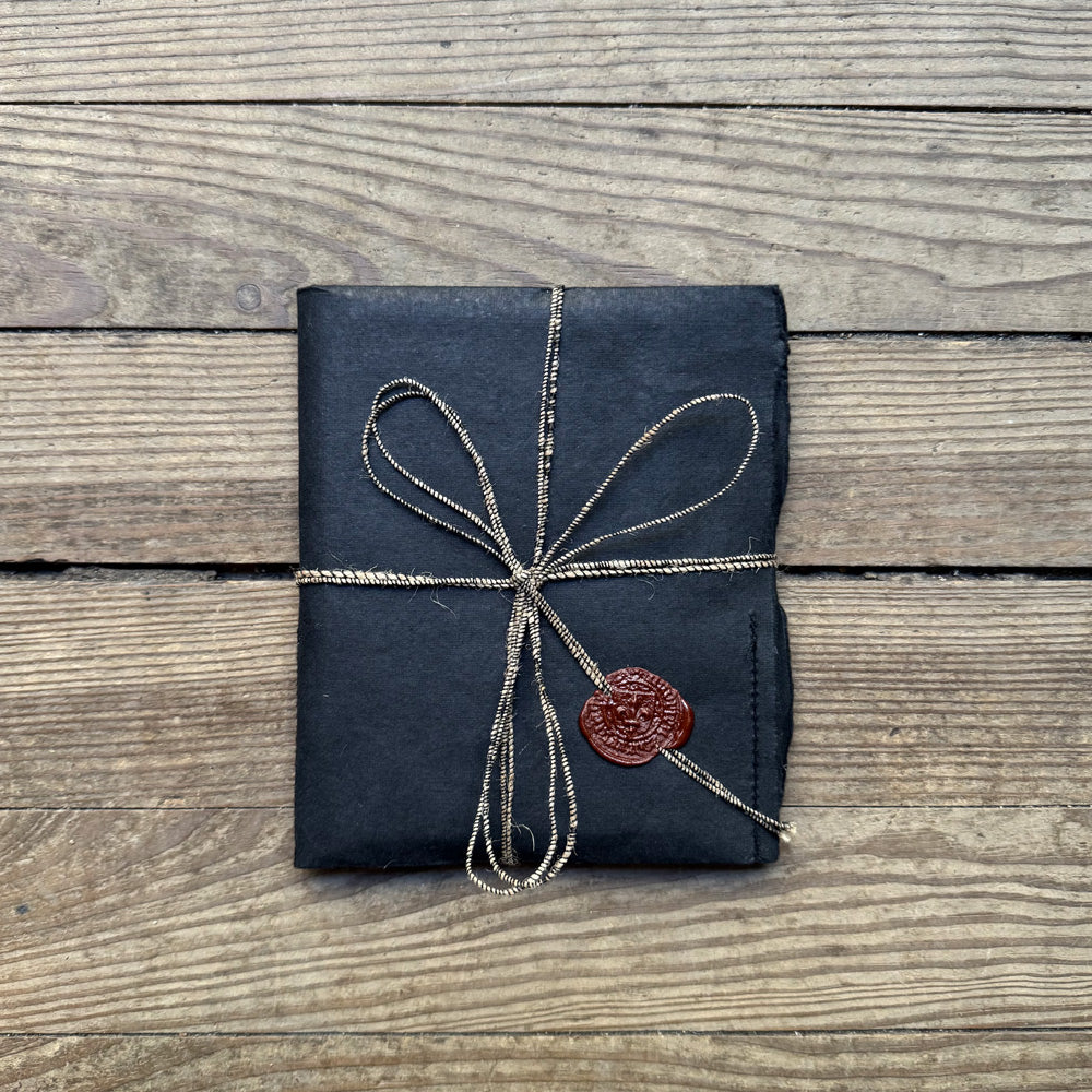 Pochette contenant 12 cartes et enveloppes en papier coton noir. La pochette se ferme à l'aide d'un cachet de cire.