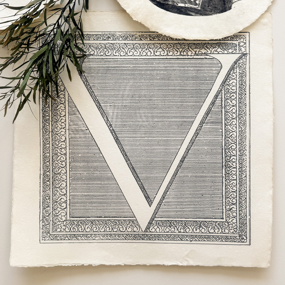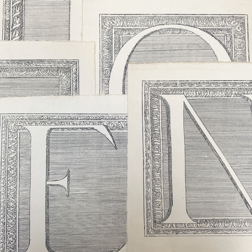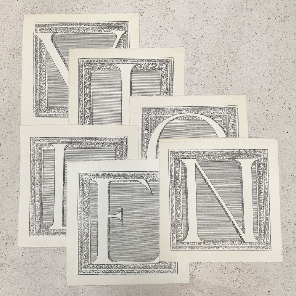 6 feuilles format 40 x 40 cm, lettre esprit alphabet antique : I -N - L - O - V - E.