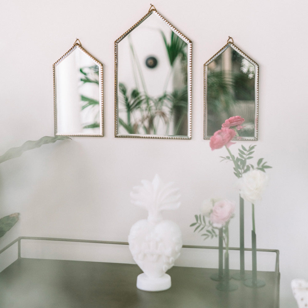 Accumulez coeur ex-votos, ornements et miroir pour une composition murale réussie.