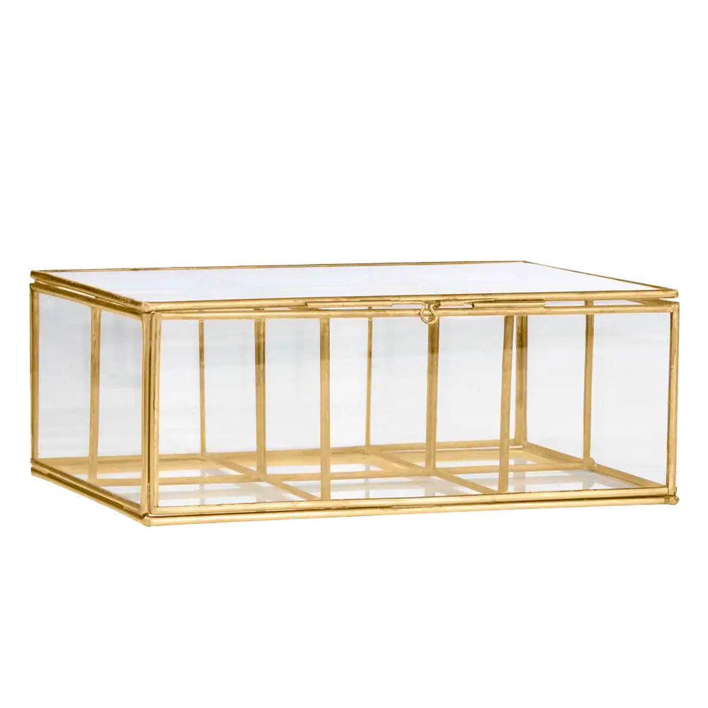 Boite en verre et en métal couleur laiton, avec 4 compartiments (3 petits et 1 grand).