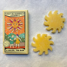 Boite contenant 2 petits savons en forme de soleil. Ils conviennent aussi bien pour se nettoyer le corps ou le visage.