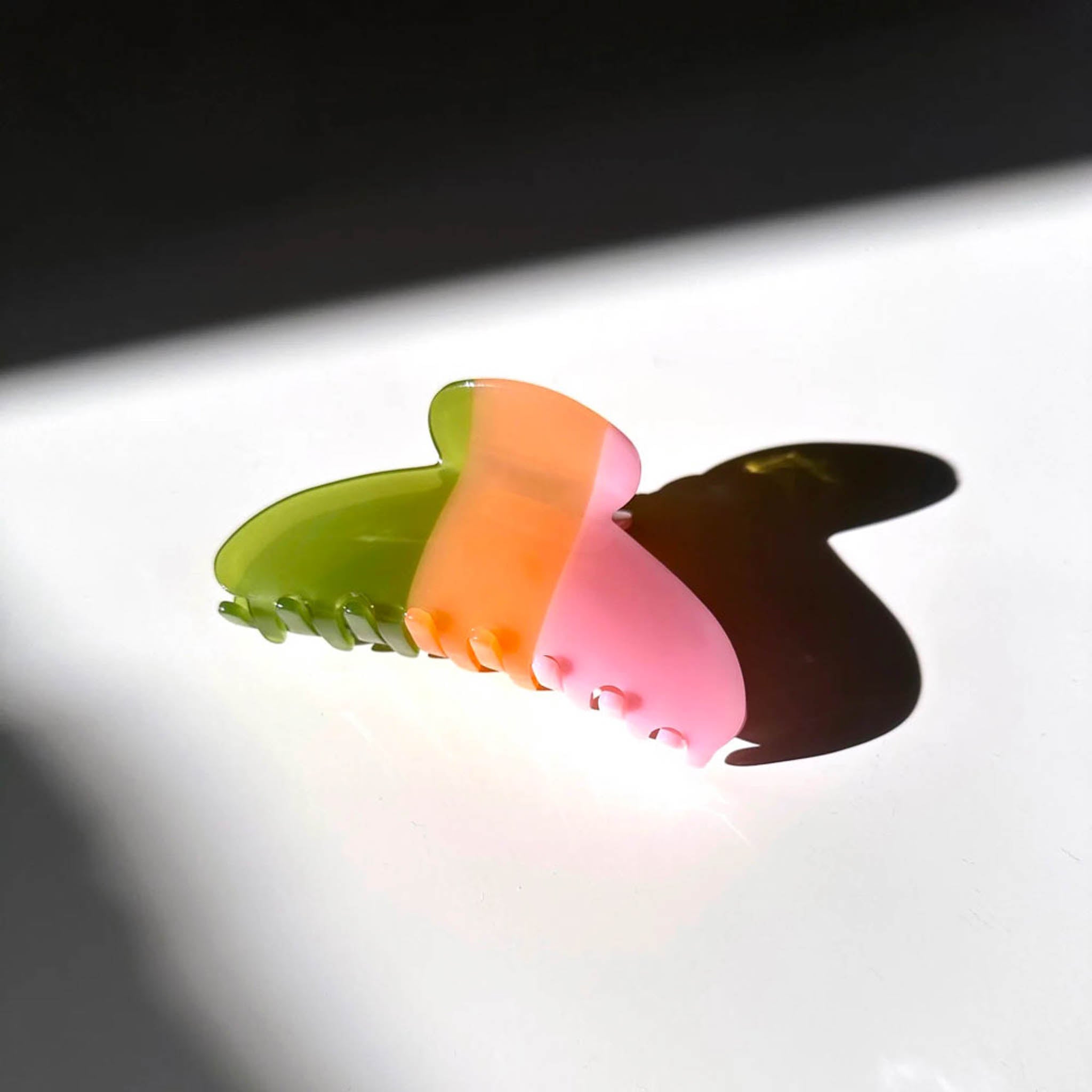 Cette pince à cheveux aux rayures multicolores est fabriquée en acétate de cellulose* avant d’être peinte à la main.