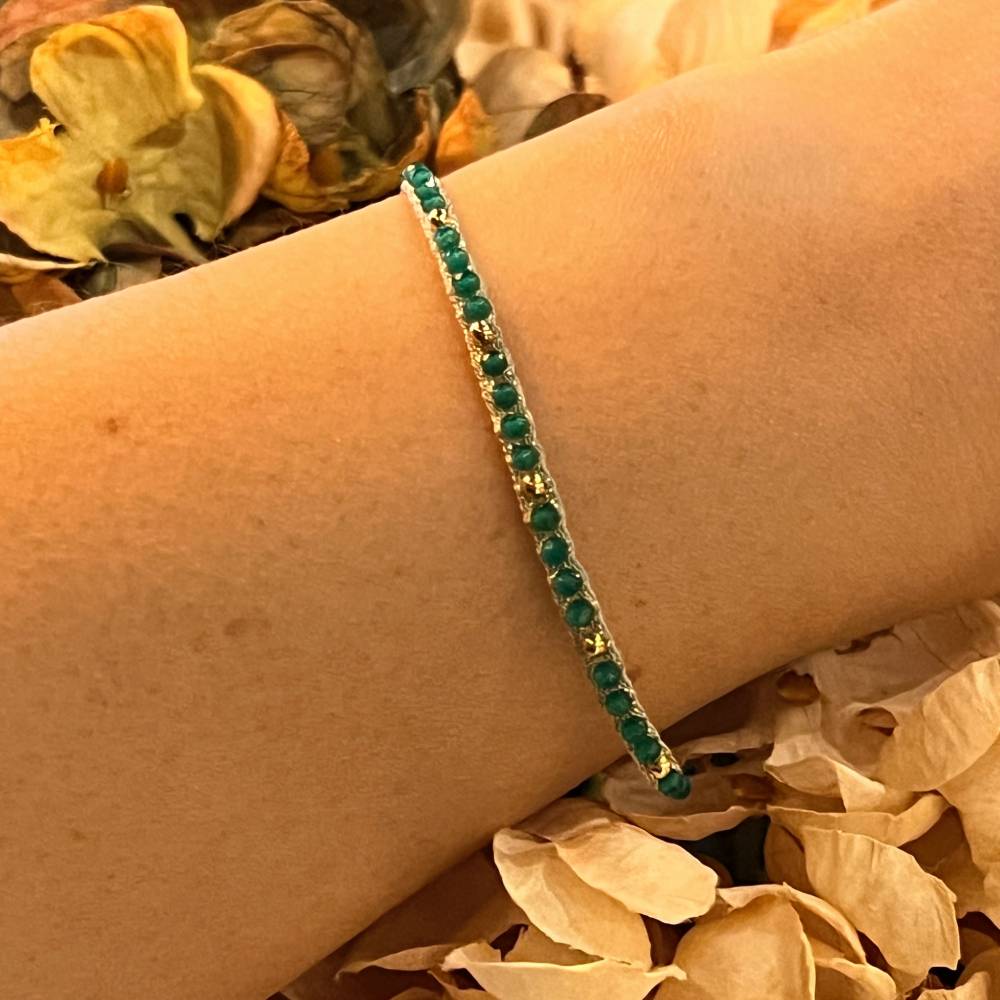 Bracelet ajustable composé de 24 fils tressés ornés de pierres perles plaquées or et de pierres semi-précieuses.