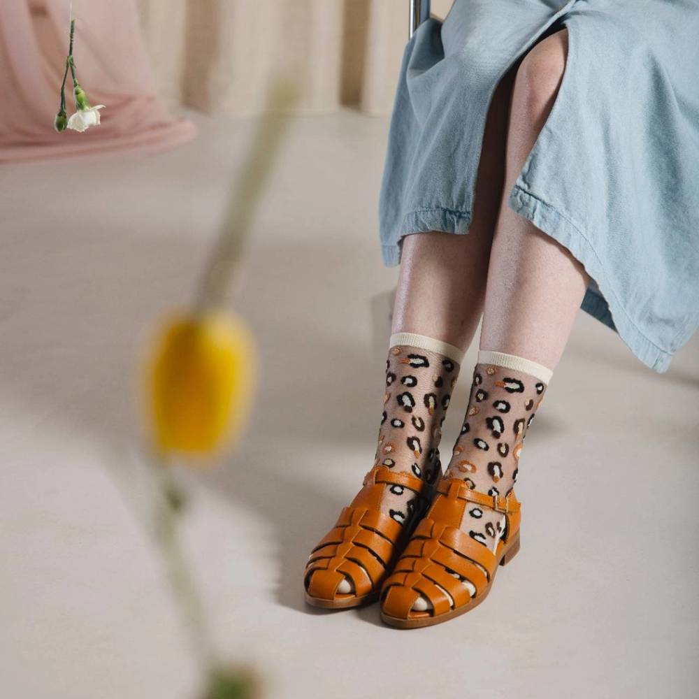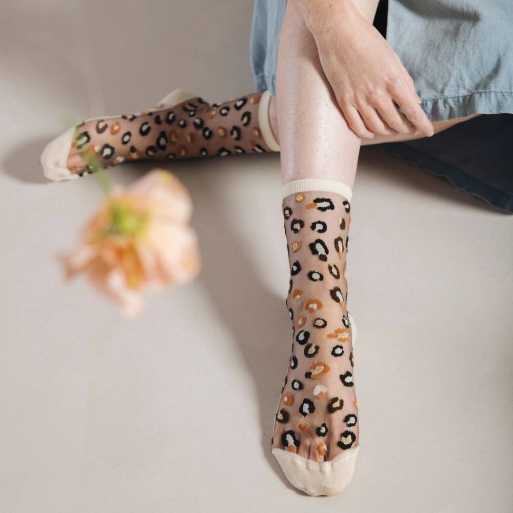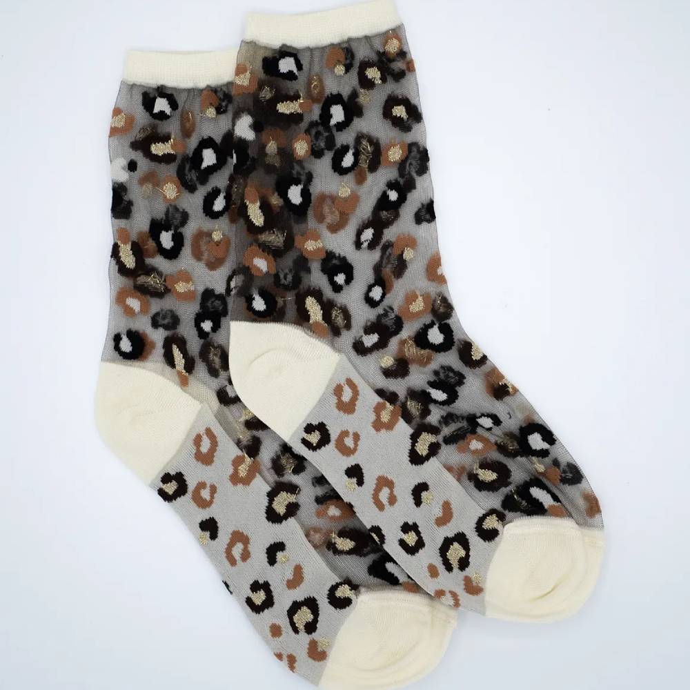 Chaussettes transparentes au motif style léopard, avec un soupçon de paillettes.
