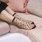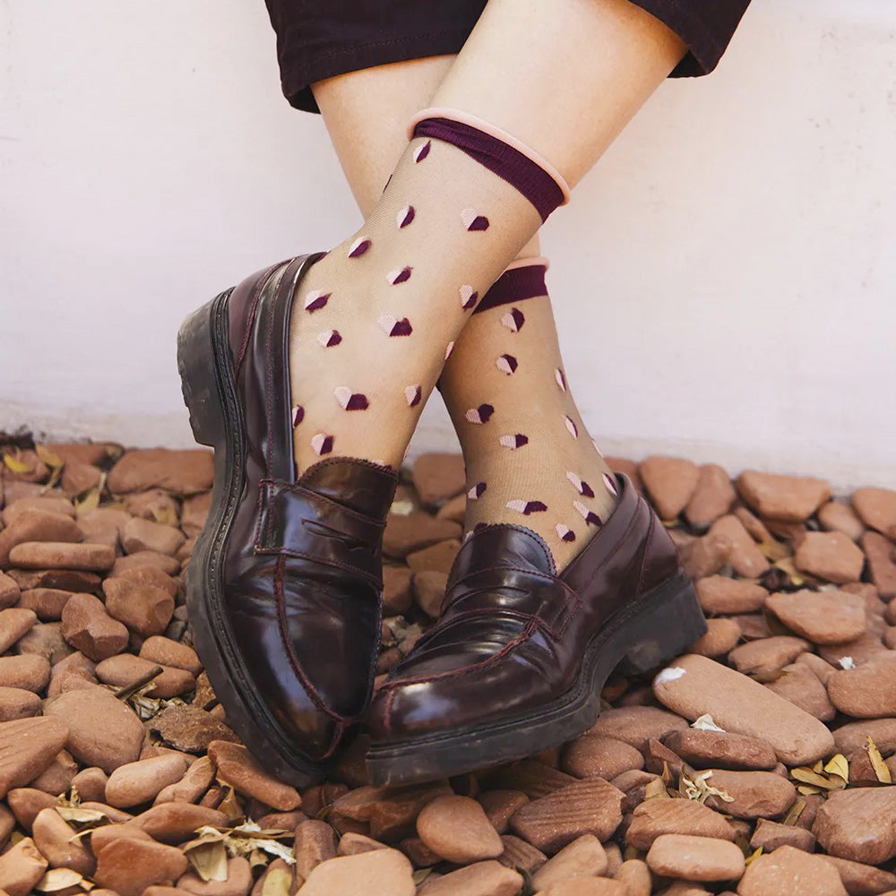 Chaussettes transparentes motif coeurs - prunes et roses.