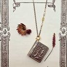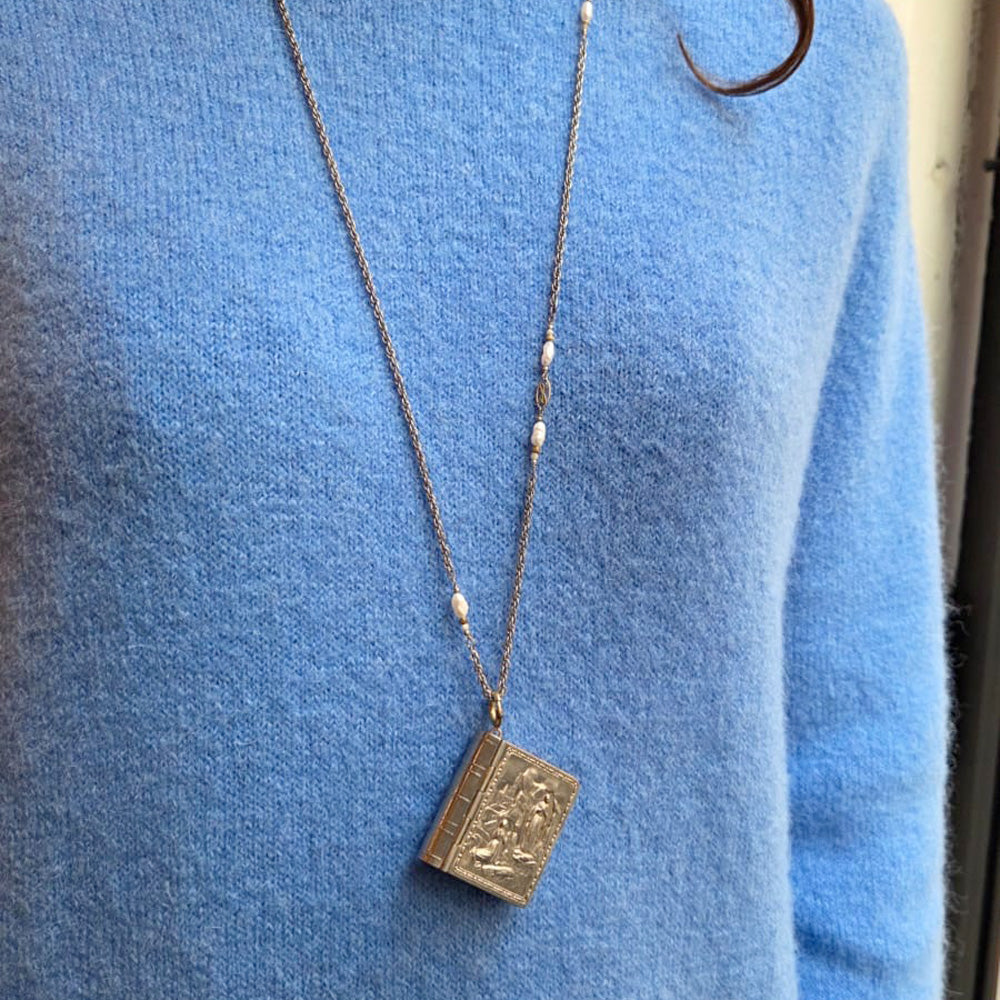 Collier Boite livre argent par Tabito - 84 cm de longueur. Ancienne petite boite de voyage montée sur une chaine en laiton vintage de montre de poche. Composition: laiton, argent, Perle de culture et Moon stone. La boite peut être utilisée comme contenant.