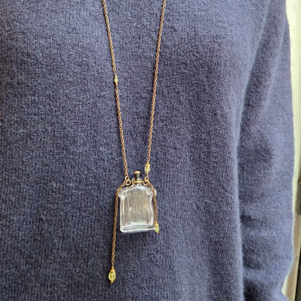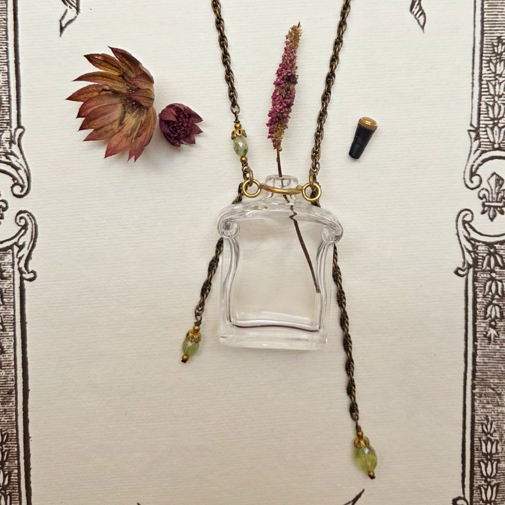 Collier Flacon de Parfum par Tabito - longueur 86cm. Flacon de parfum vintage monté sur un bouton de montre de poche et sur une chaine laiton. Composition : laiton, Pyrite et Nacre. Le flacon peut être utilisé comme contenant.