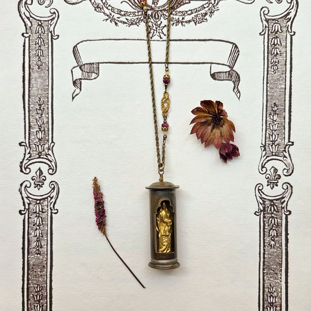 Collier statue Chapelle par Tabito - longueur 86cm, pendentif statue Vierge.