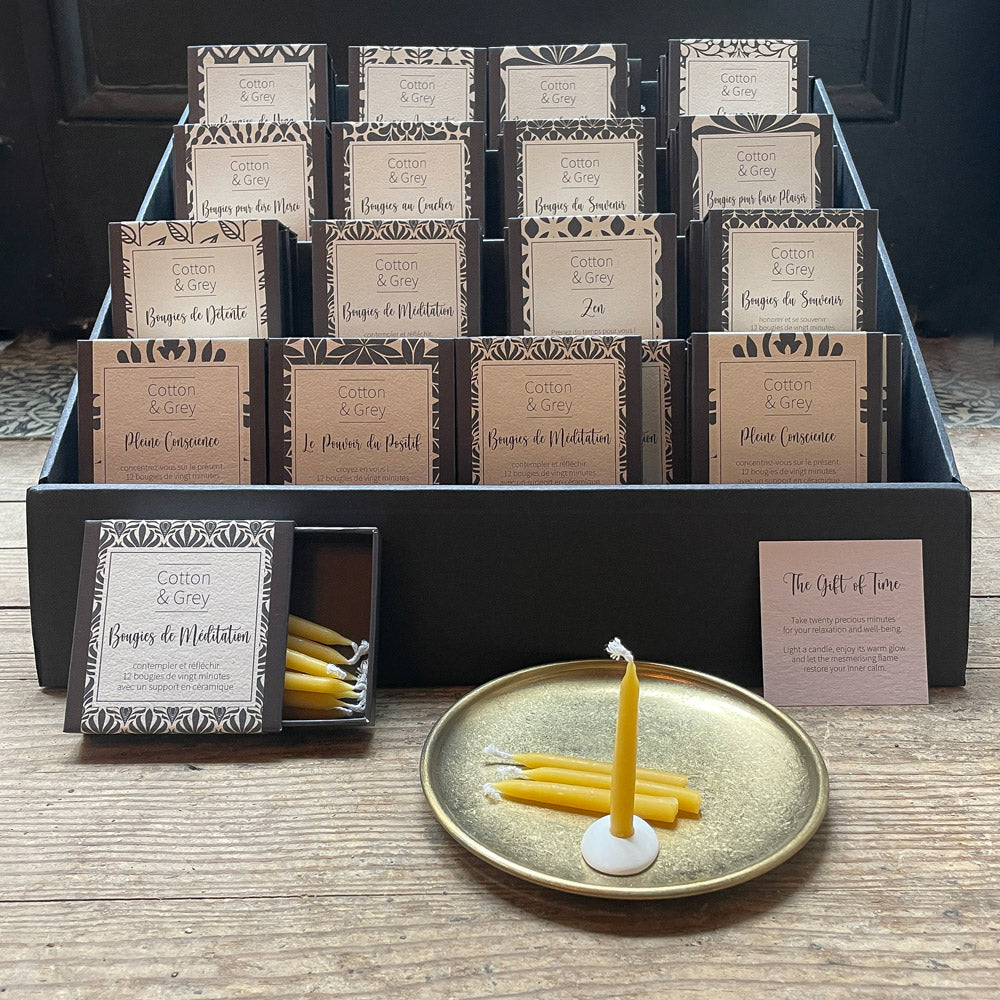 Accordez-vous du temps et apaisez votre esprit avec ce kit de 12 bougies en cire d'abeille pure. Chaque bougie vous offre 20 minutes de relaxation. Pour soi ou pour offrir, choisissez le message que vous souhaitez porter.