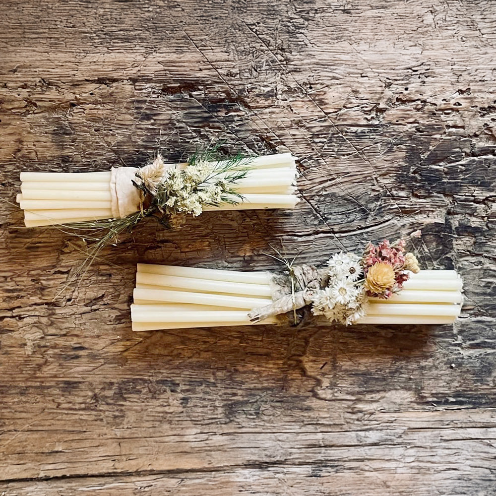 Lot de 15 bougies en cire d'abeille, enroulées dans un ruban de soie. Elles sont disponibles en format S ou M.