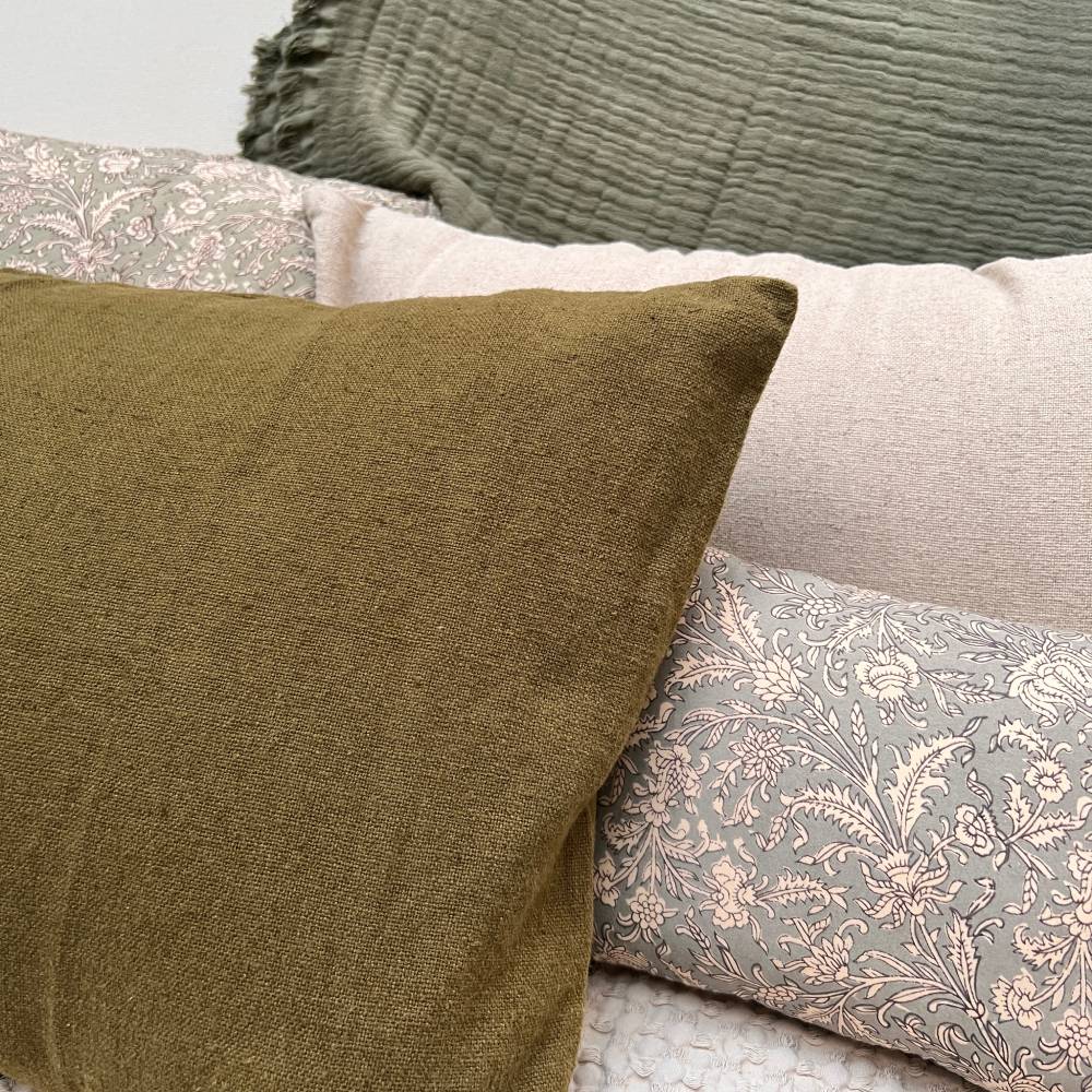 Coussin en lin et coton lavé, coloris olive.