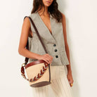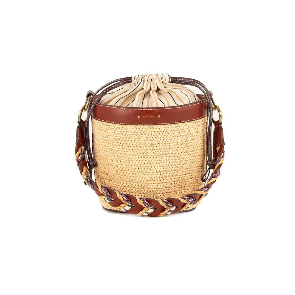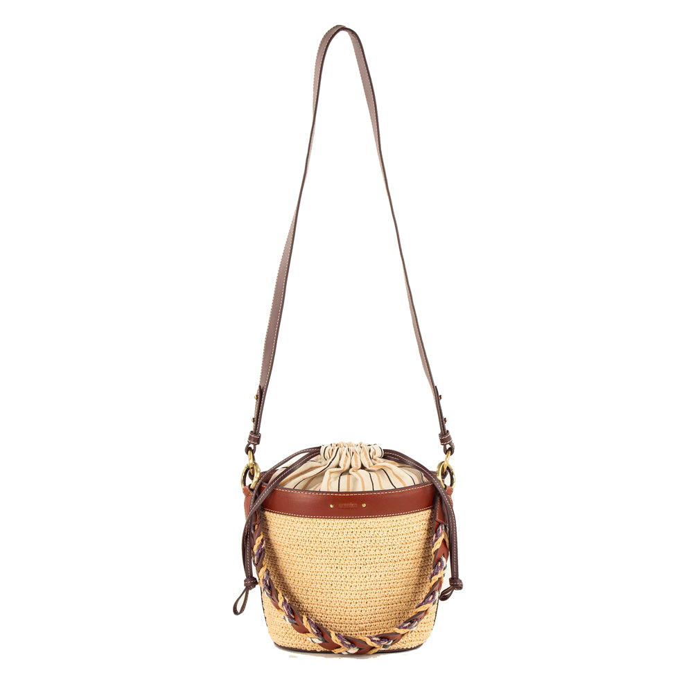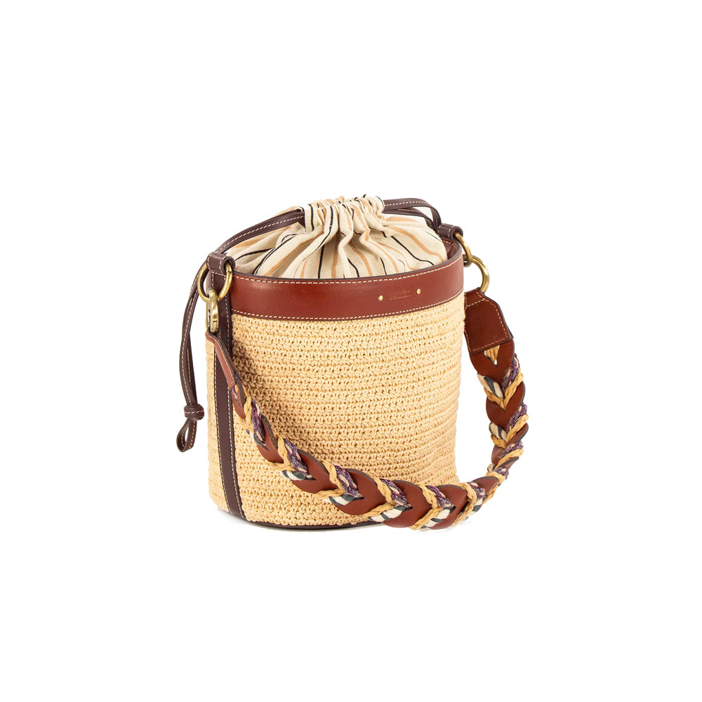 Sac Sessun mélangeant plusieurs matières : corps en tressage de coton ciré et empiècements en cuir. Une bandoulière cuir et une anse fantaisie tressée de cordes et raphia.