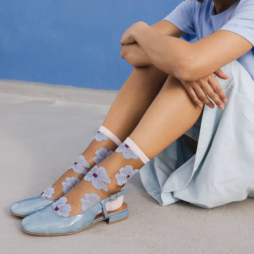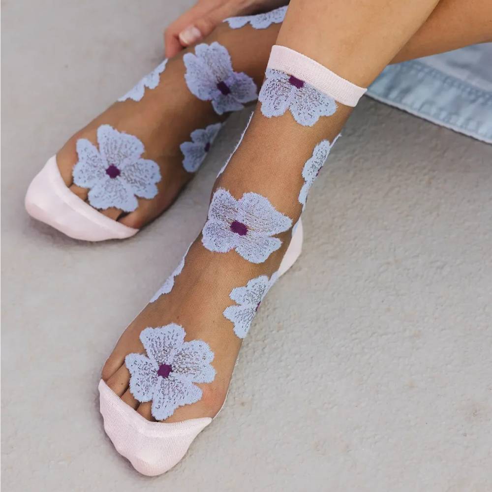 Chaussettes transparentes coloris mauve, aux motifs inspirés des fleurs de la ville de Murano, près de Venise.