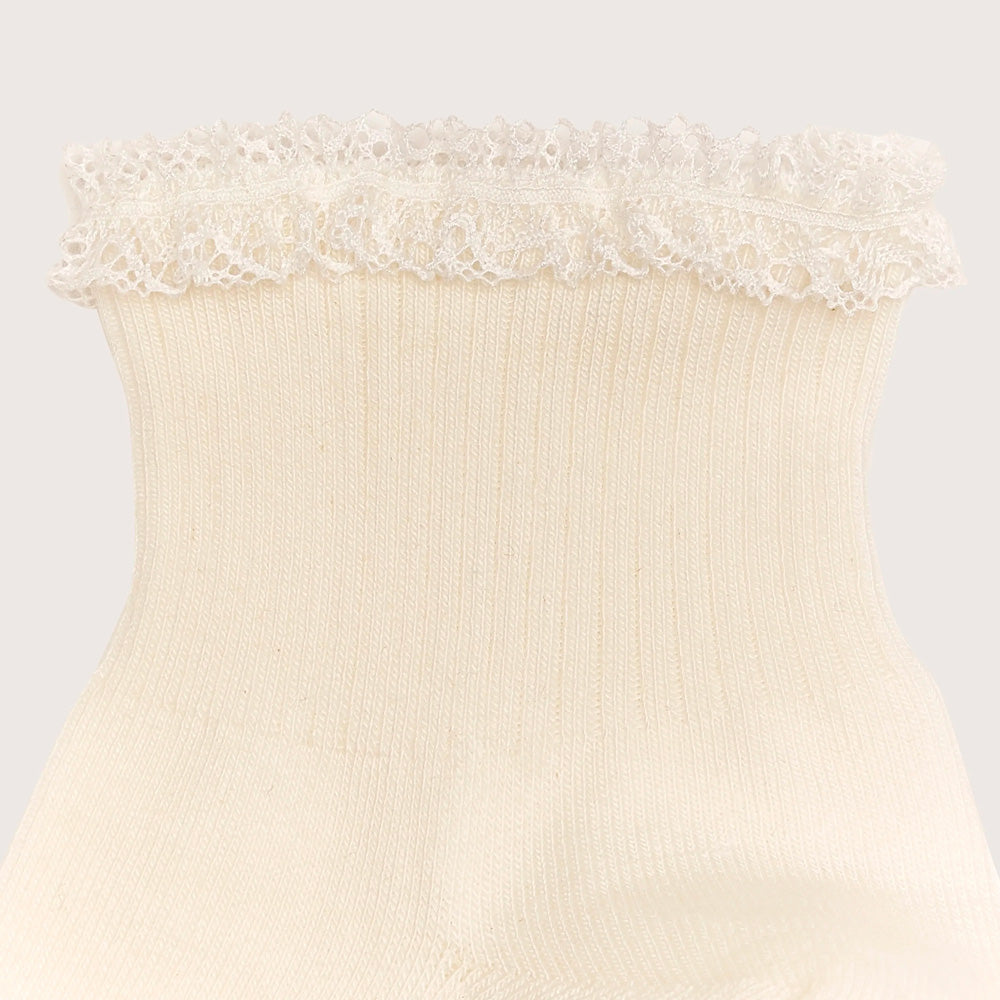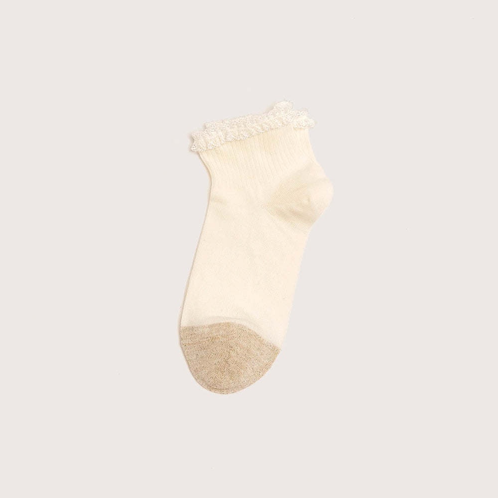 Chaussettes côtelées écrues, dentelle blanche et finition beige brillante au niveau des orteils.