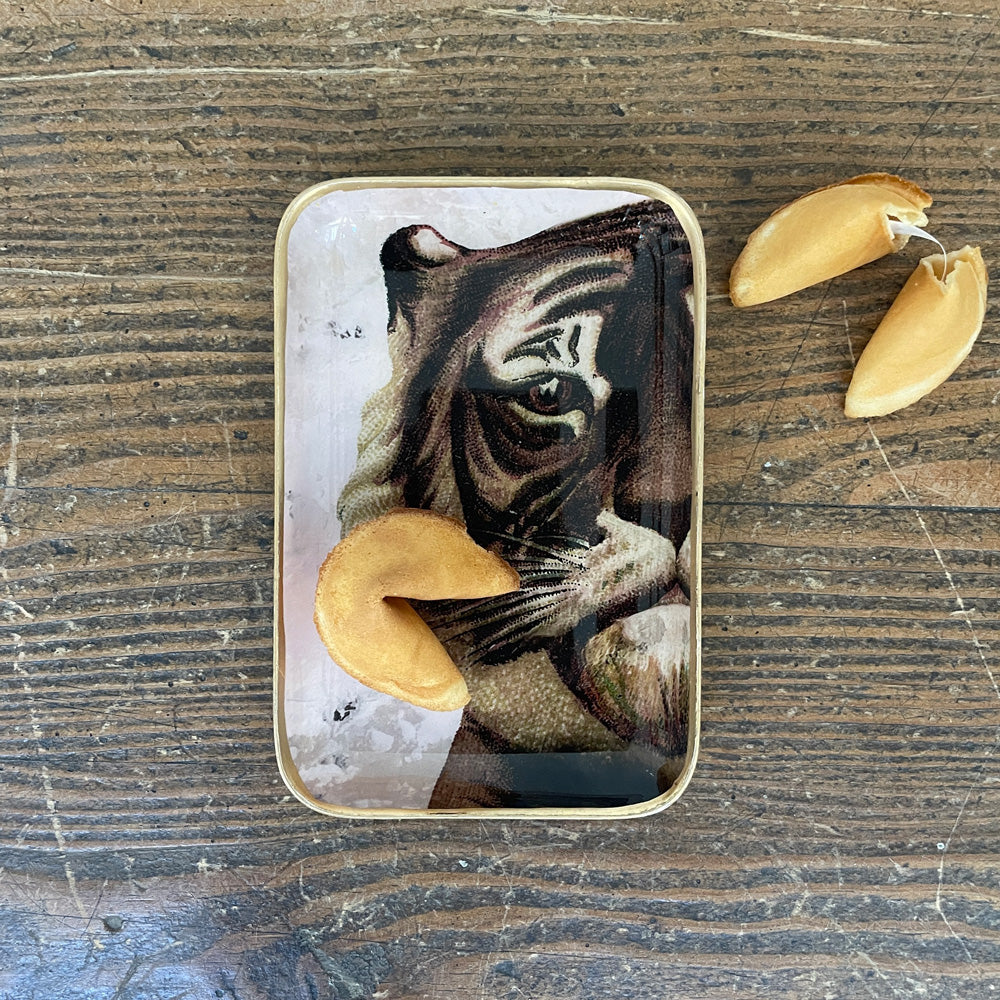 Small rectangular “Tiger” tray in enameled aluminum by Boncoeurs.