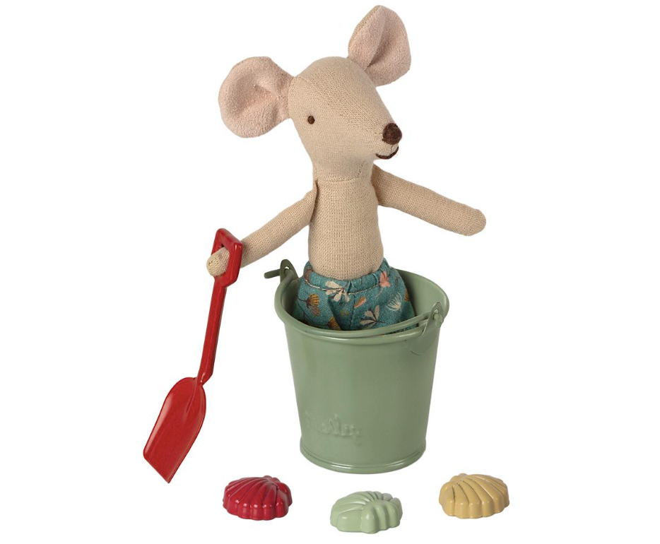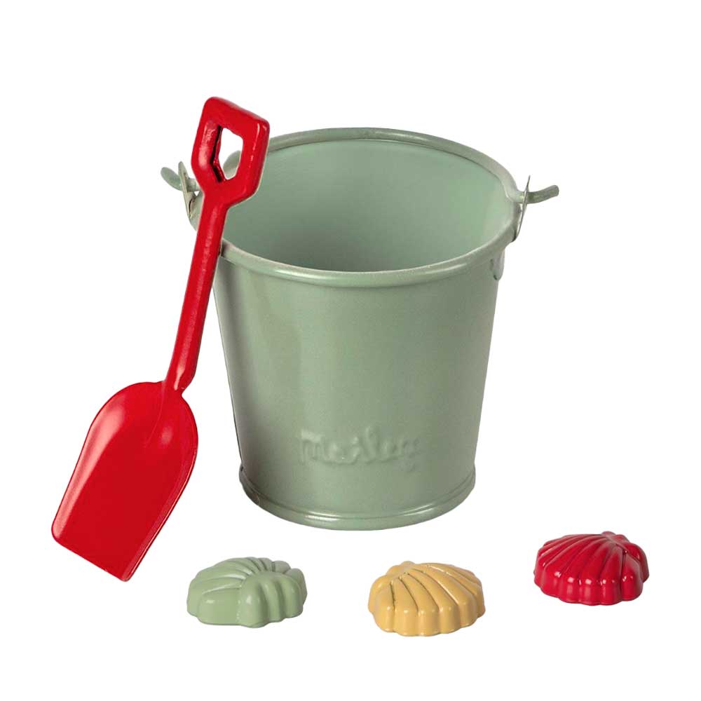 Maileg beach set containing 1 bucket, a shovel and 3 shell molds.