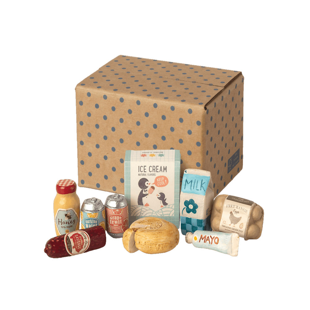Small box of Maileg grocery products containing: Mayonnaise, milk, honey, sausages, ice cream, egg, cheese, soda.
