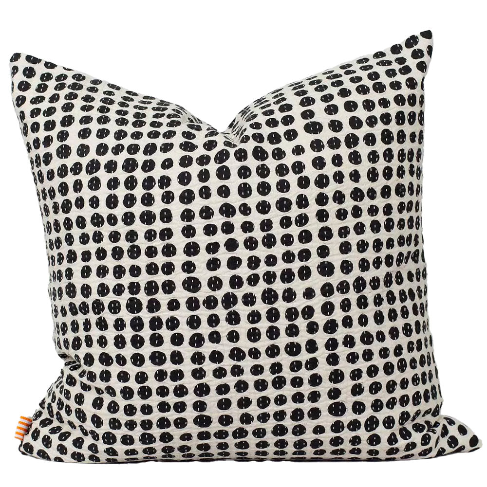 Quilted cushion cover printed with black polka dots on a white background.
