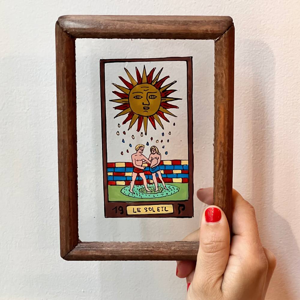 Handcrafted frame in wood and glass, illustrating the arcana of the sun.