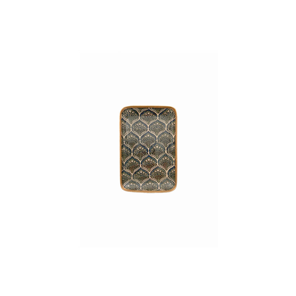 Small rectangular tray "Les paons" in enameled aluminum by Boncoeurs. Its pattern is inspired by the peacock fan.
