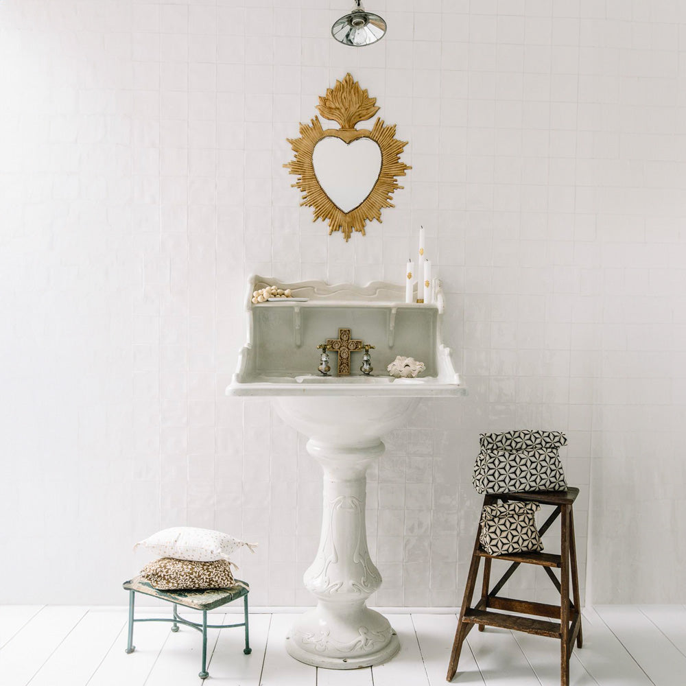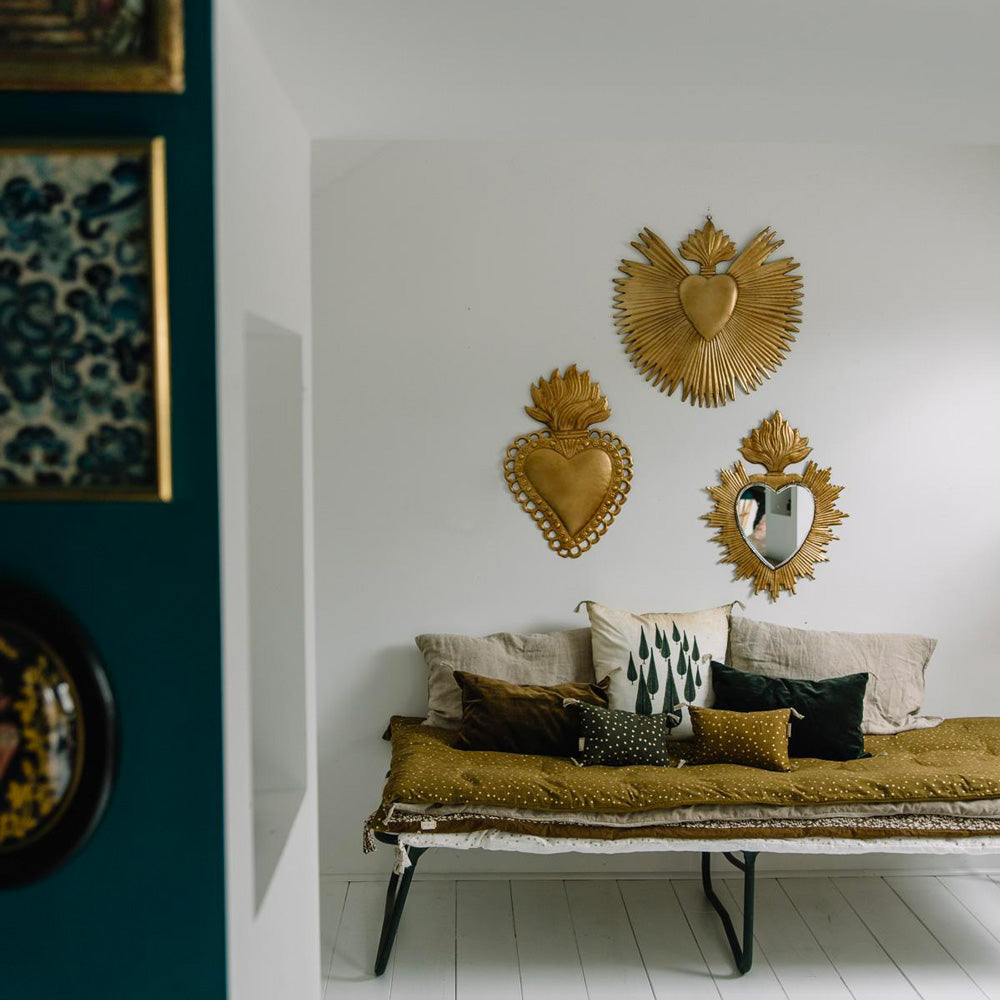 Collect ex-votos hearts, ornaments and mirrors for a successful wall composition.