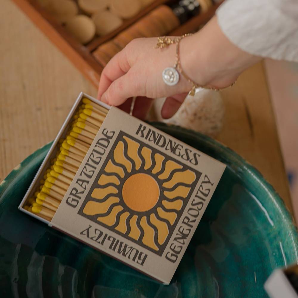 Box of 125 matches illustrated, in a vintage 70s style, with a sun and the following words: "Gratitude", "Kindness", "Generosity" and "Humility"