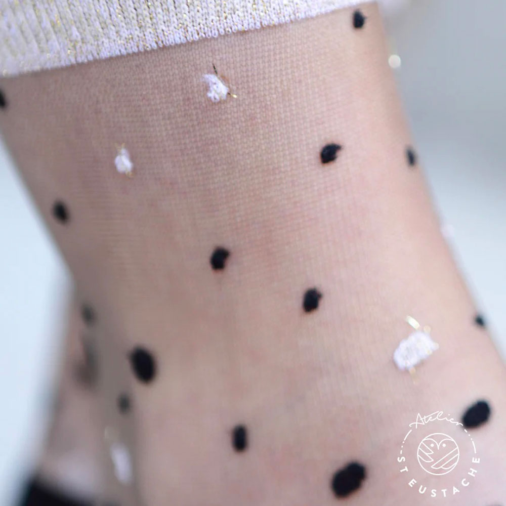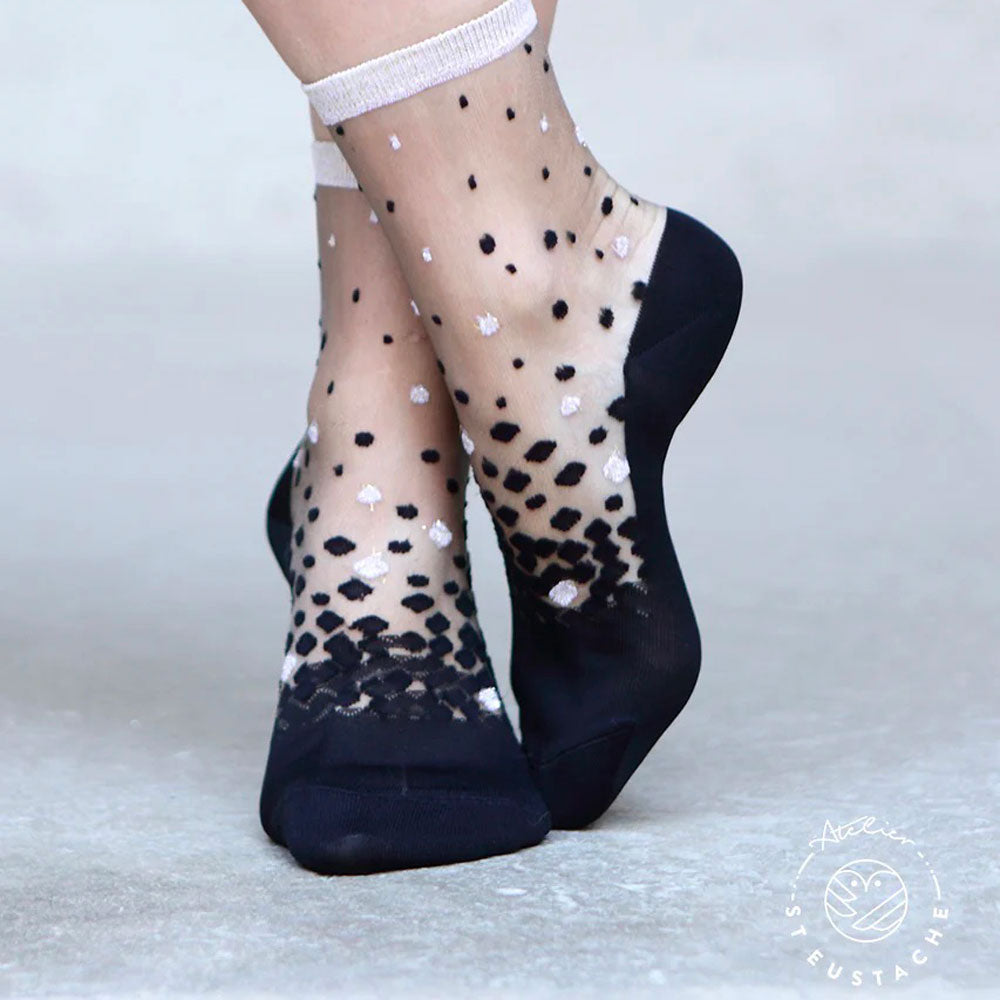 Transparent socks - black and gold polka dots.