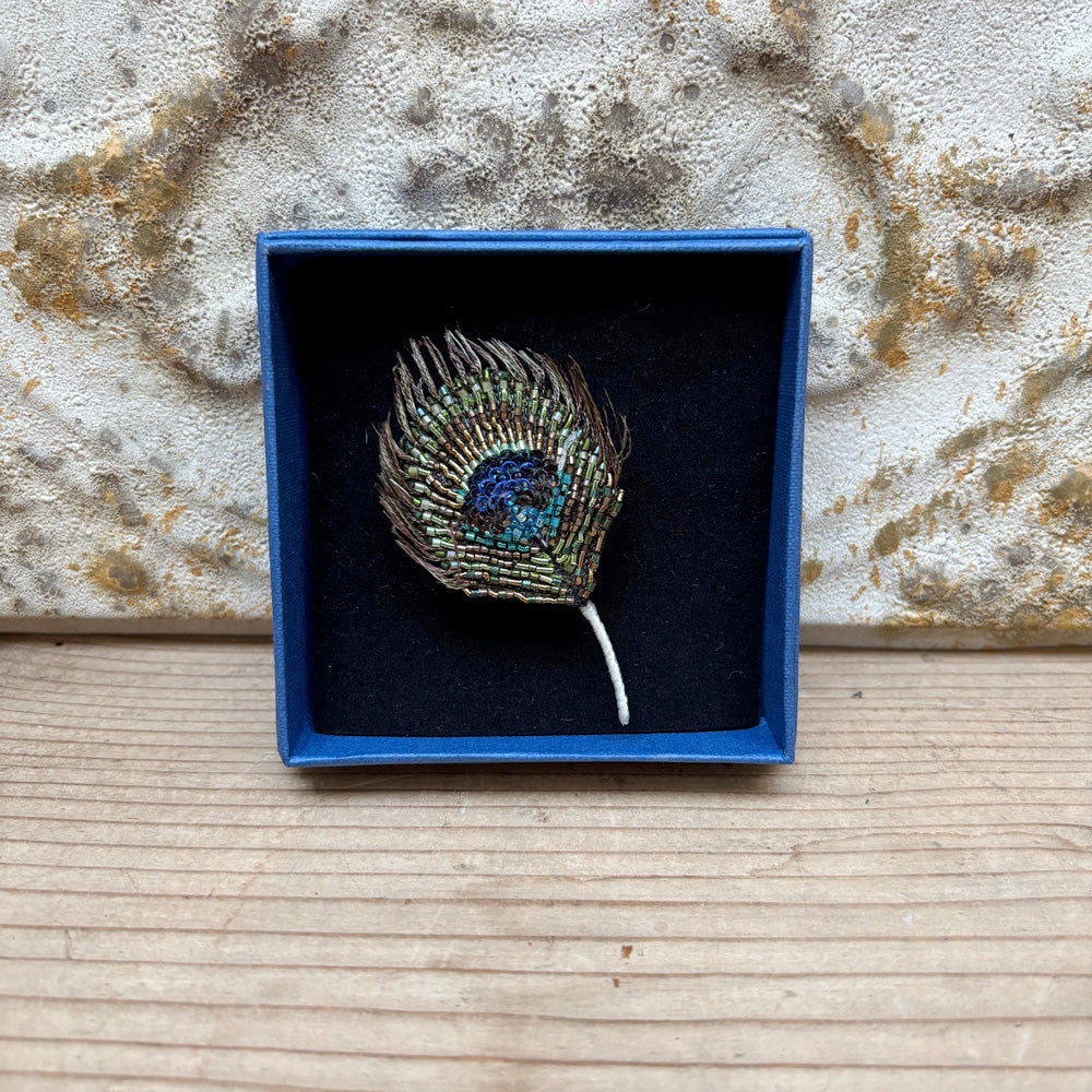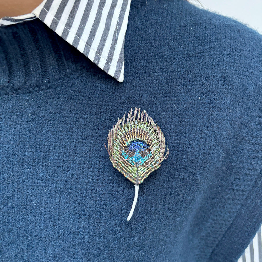 Broche plume de paon, fabriquée artisanalement en Inde en petites séries.