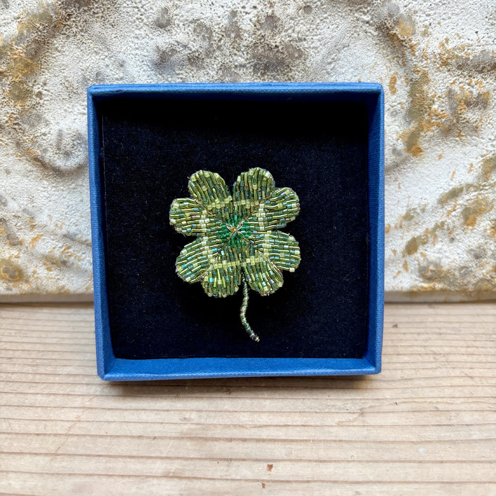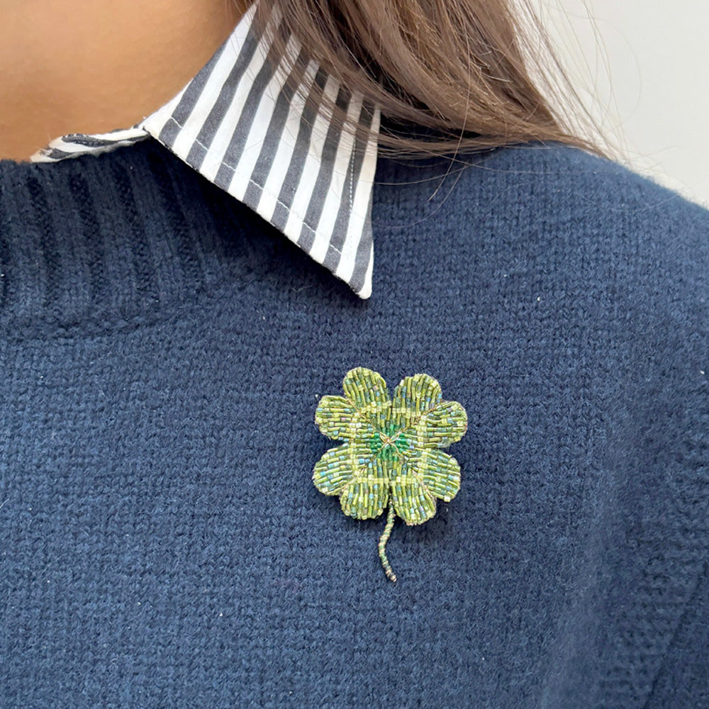 Broche trèfle, fabriquée artisanalement en Inde en petites séries.