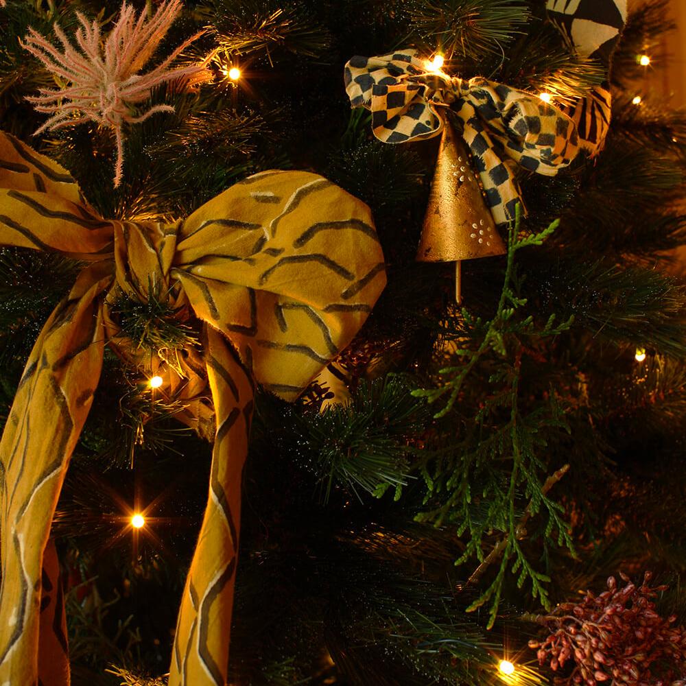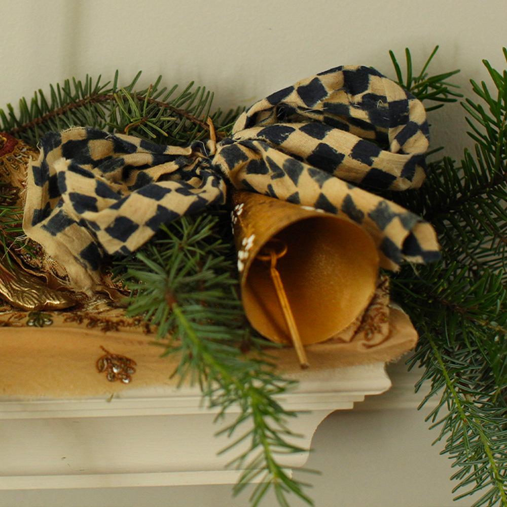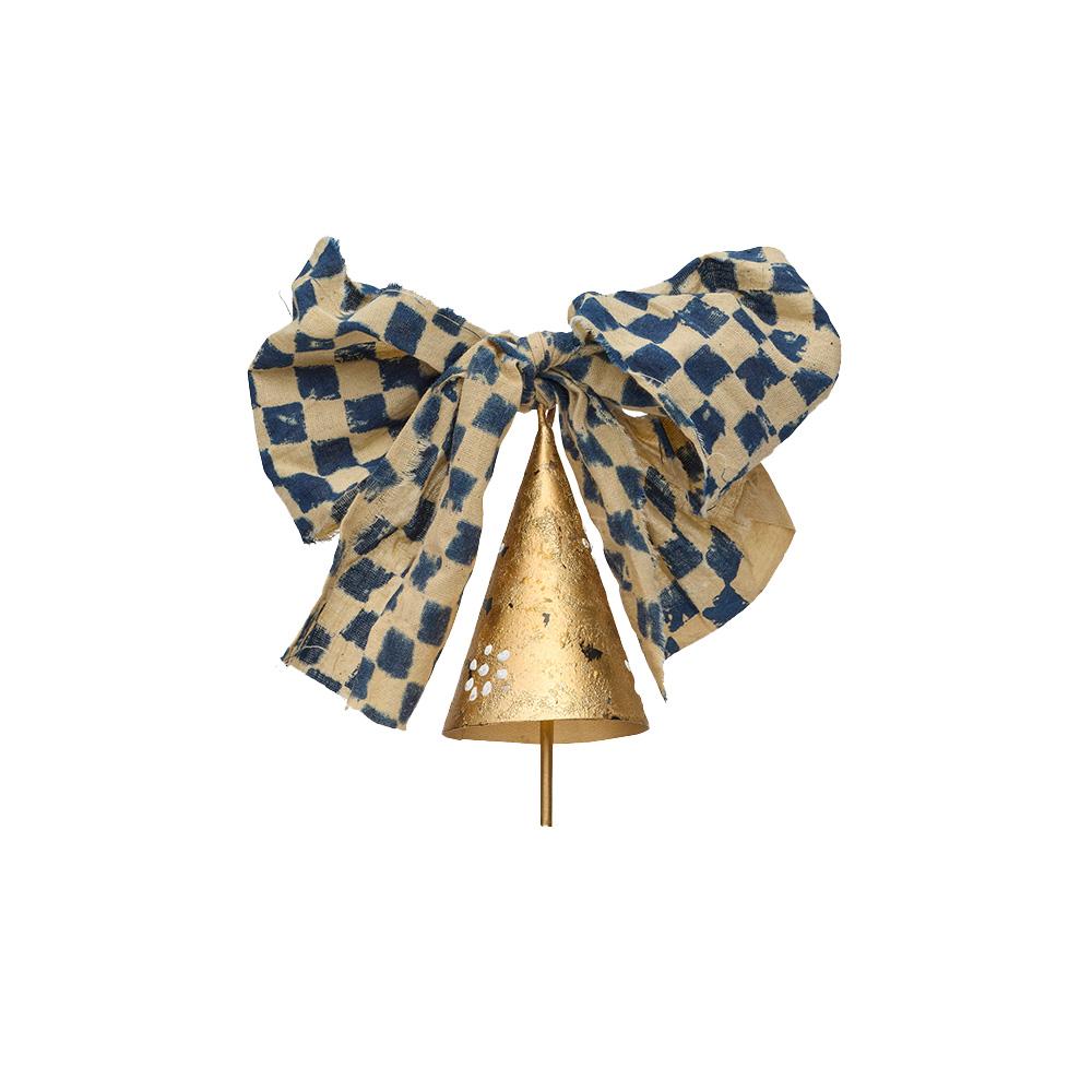 Brass bell suspended from a block-print cotton ribbon.