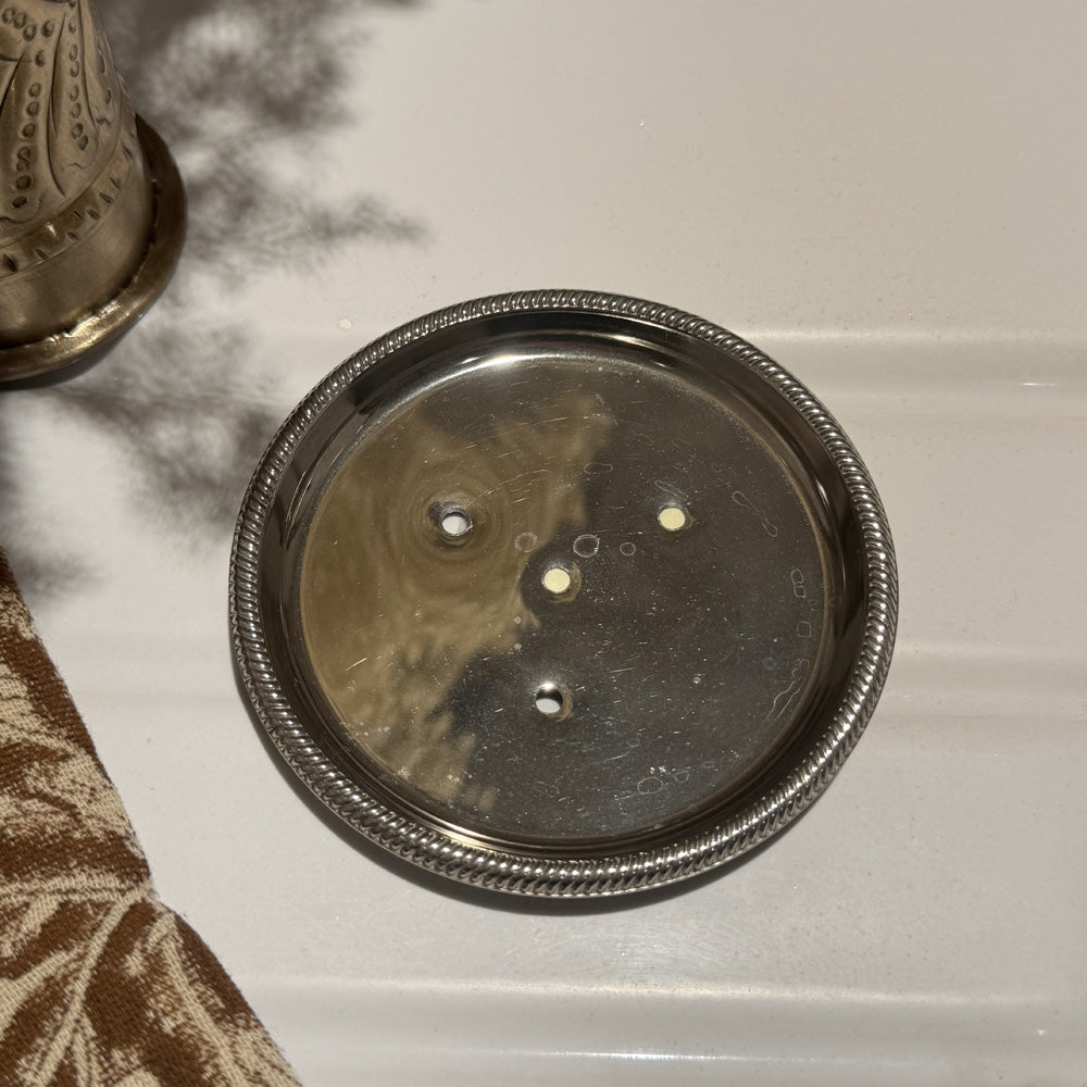 Metal soap dish, three holes allow water to drain.