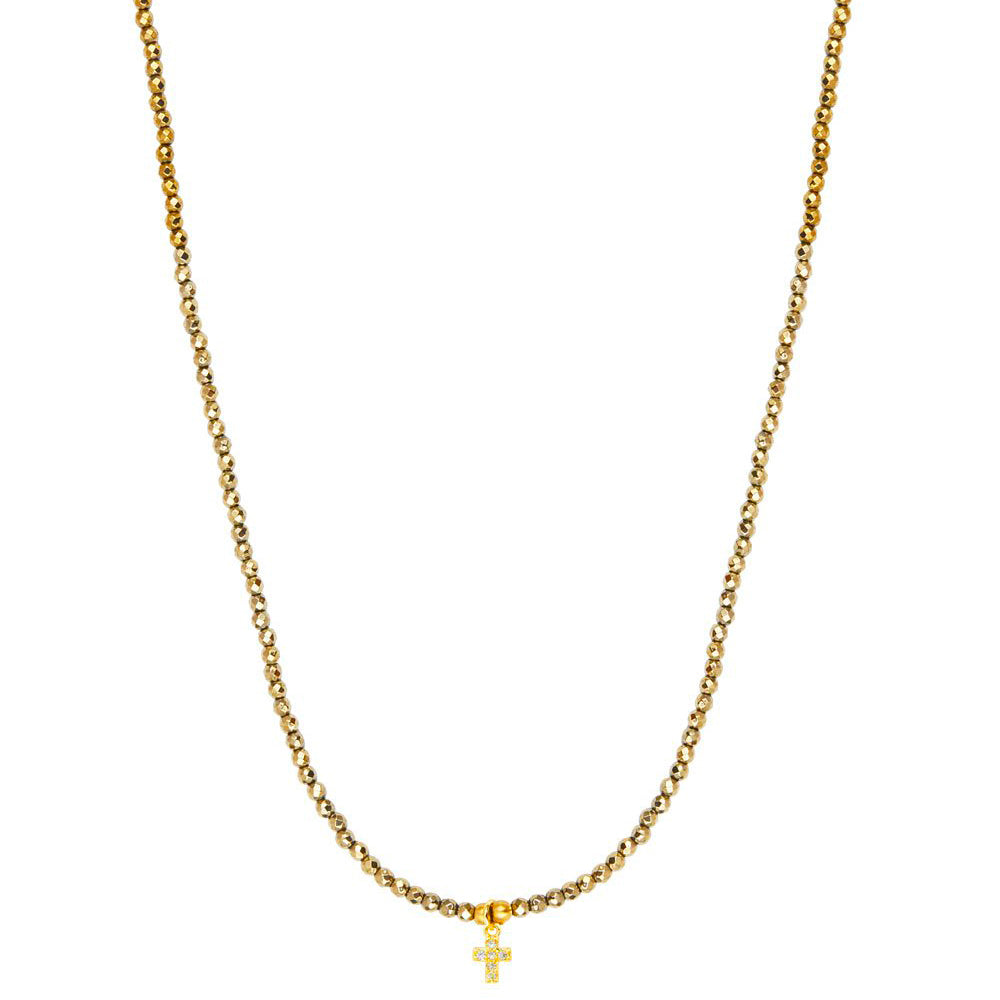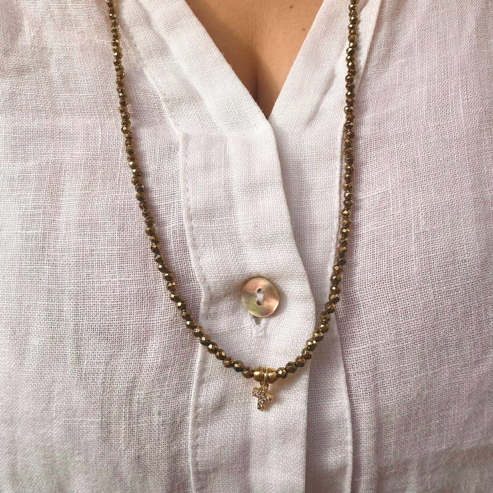 Kharmari necklace in brass beads, agate and rhinestones, with a small cross pendant.