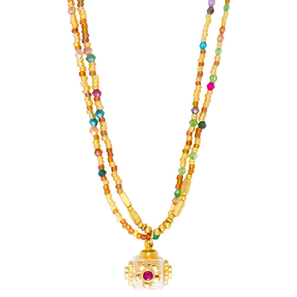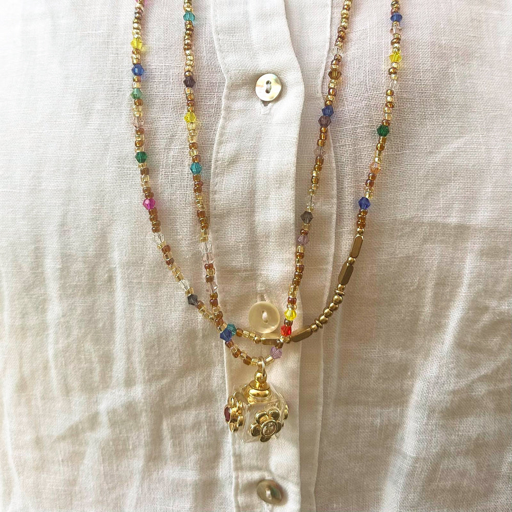 Double pearl necklace with a bottle pendant. You can fill the bottle with perfume or essential oil.