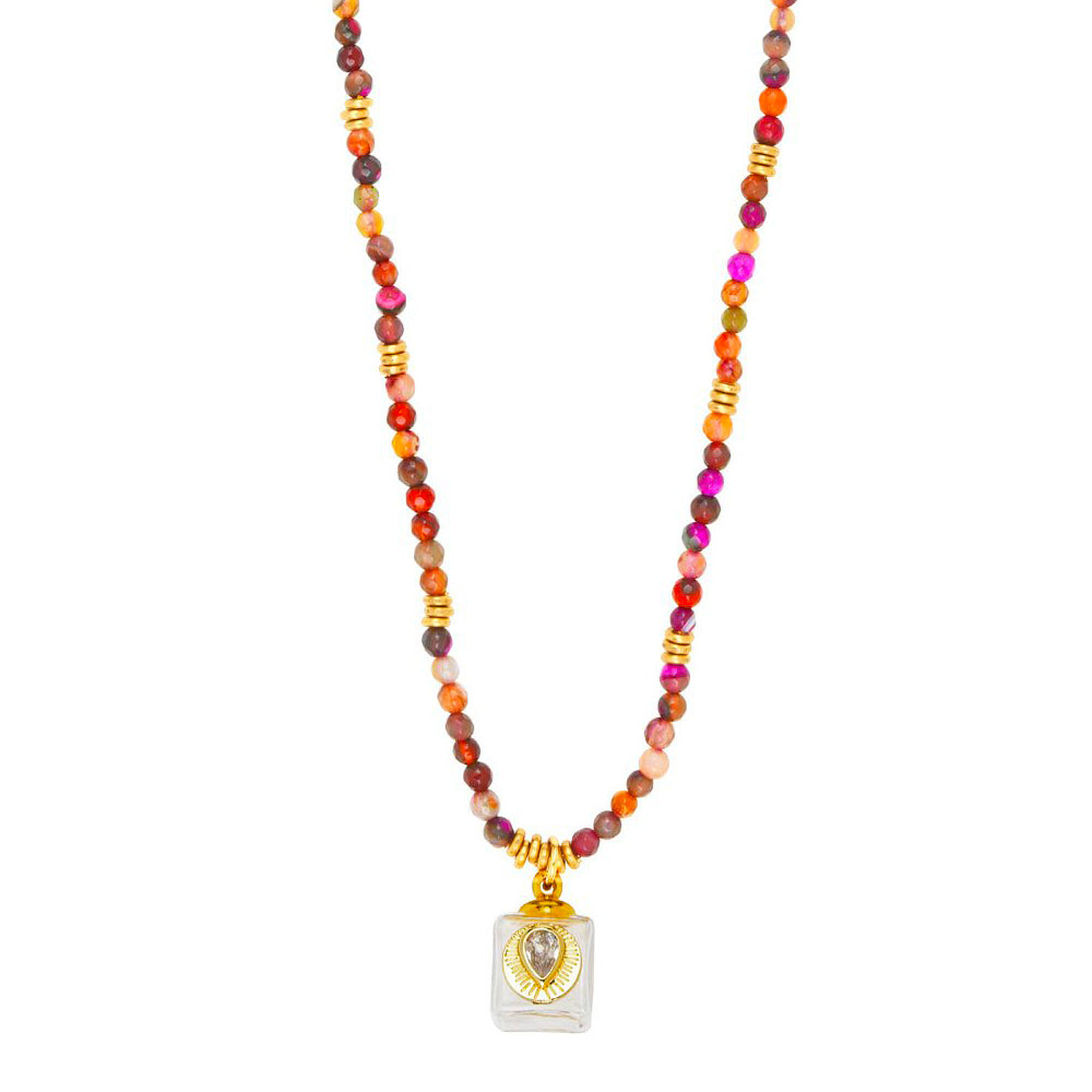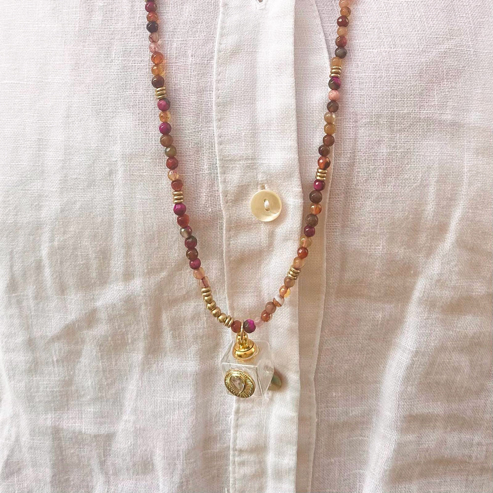 Pearl necklace with a bottle pendant. You can fill the bottle with perfume or essential oil.