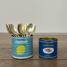 Sélectionnés pour leur esprit « boîte de conserve » et le joli imprimé citron et harissa. Vous pourrez y ranger vos couverts, du sucre, etc, ou en guise de mini caches pots!