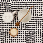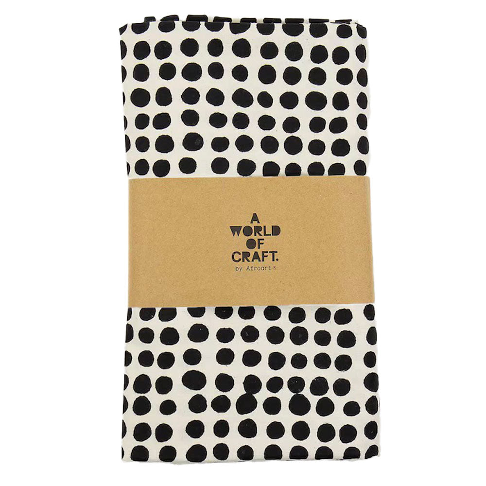 Nappe à pois noires sur fond blanc, d'une dimension de 140 x 250 cm.
