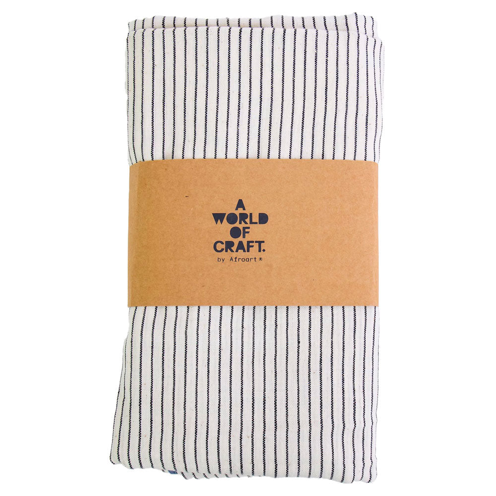 Nappe à fines rayures noires sur fond blanc, d'une dimension de 140 x 250 cm.