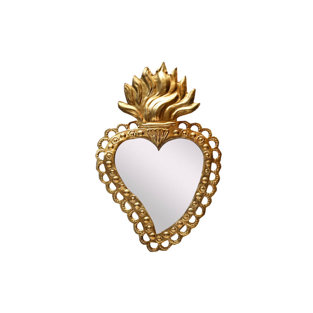 Accumulez coeur ex-votos, ornements et miroir pour une composition murale réussie.